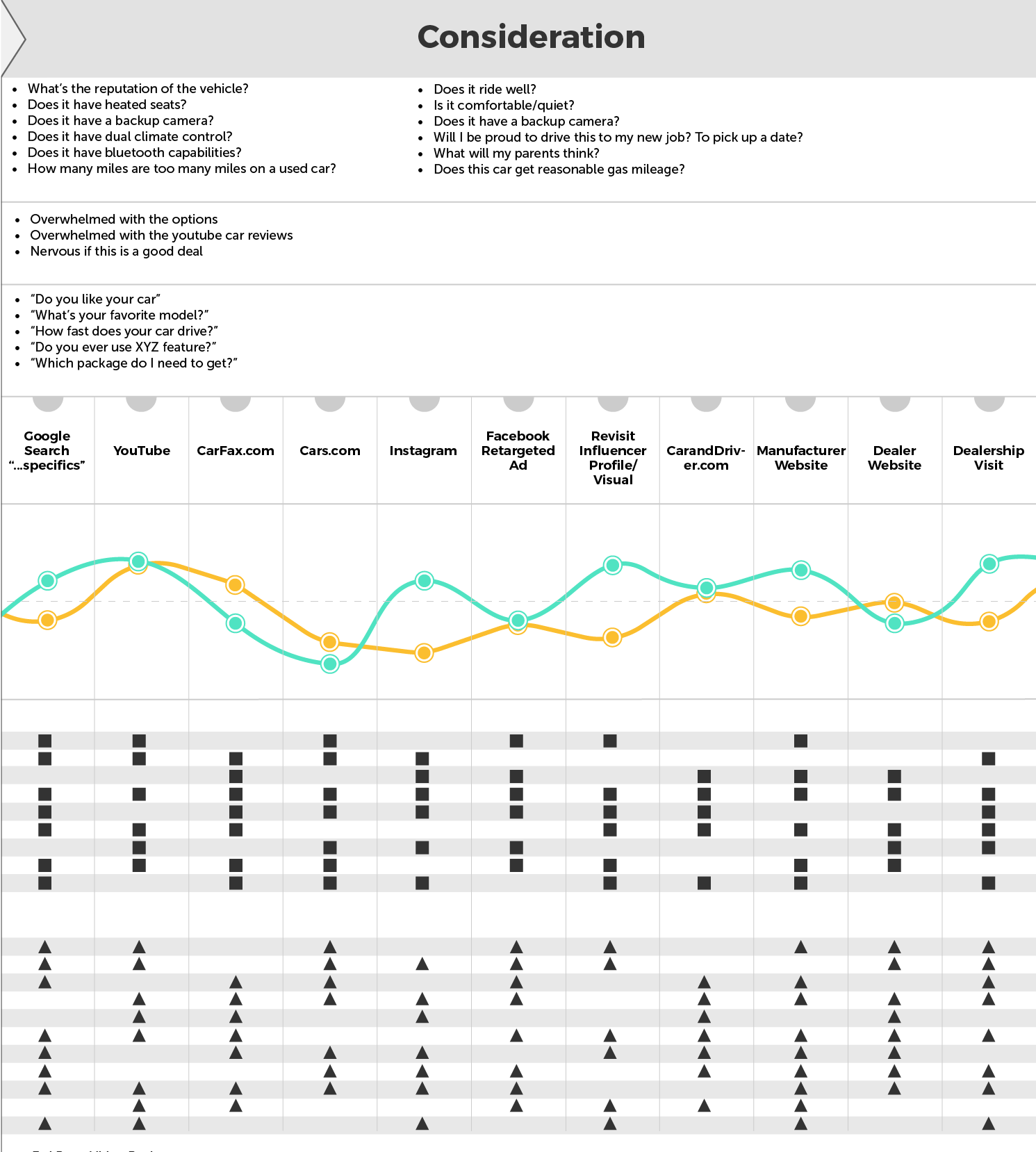 Let’s reexamine the car buyer CIM, this time looking vertically. As you can see here, there’s a convergence of the lines between the Google search and Instagram touchpoints. Here, both cohorts of people are happy, things are good.
