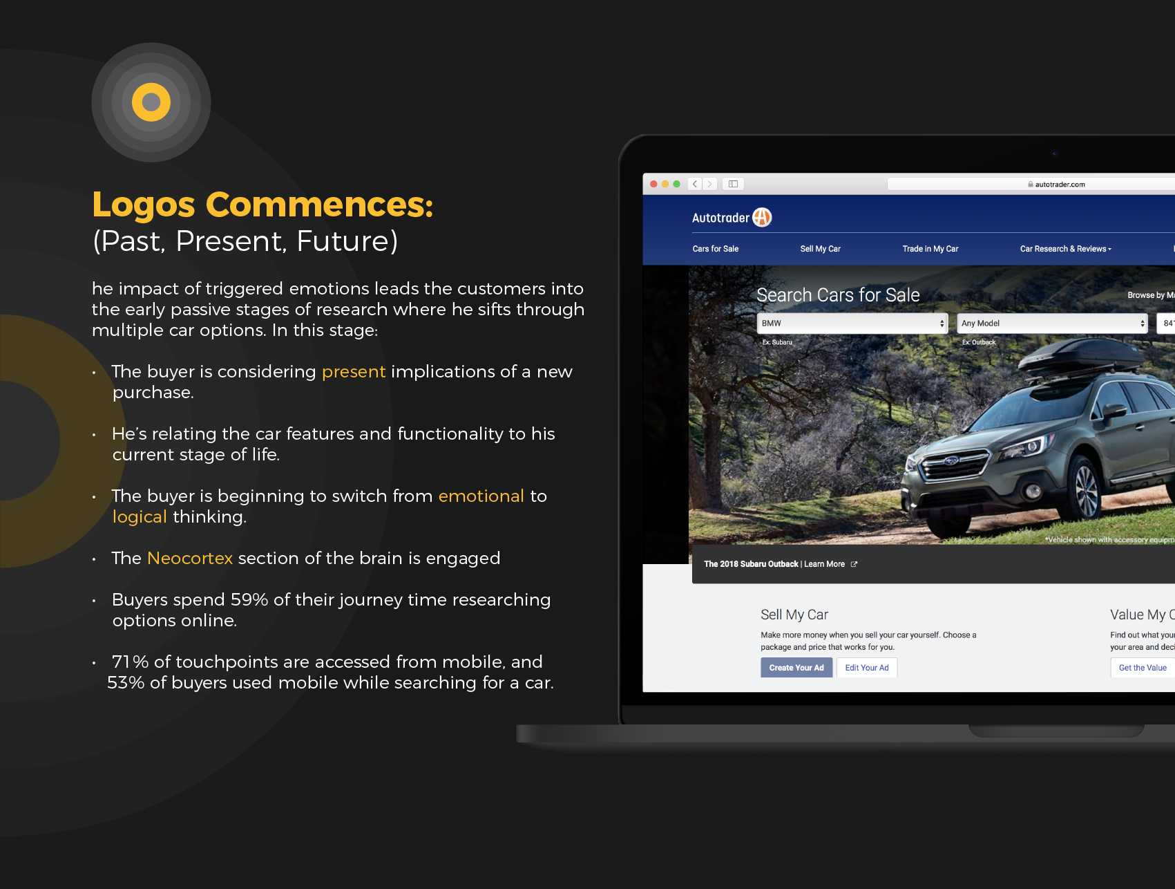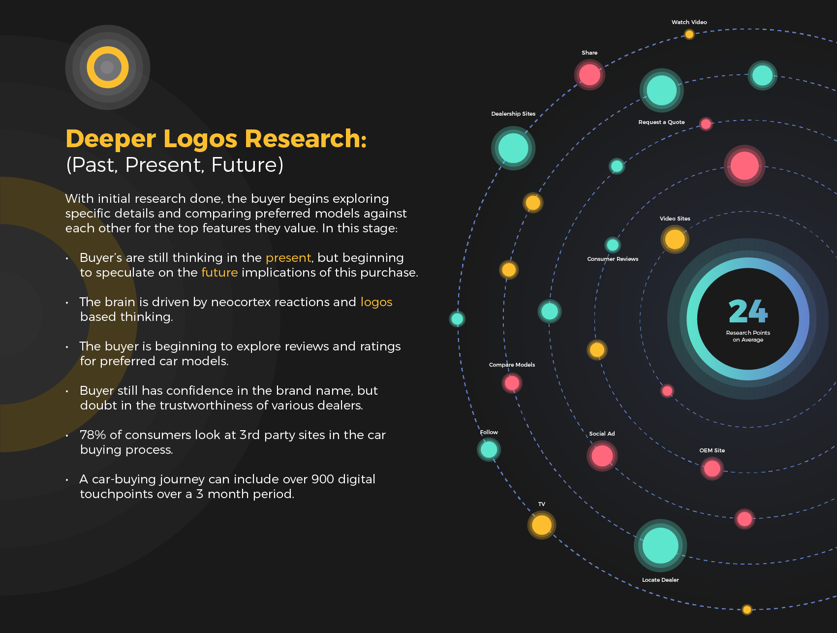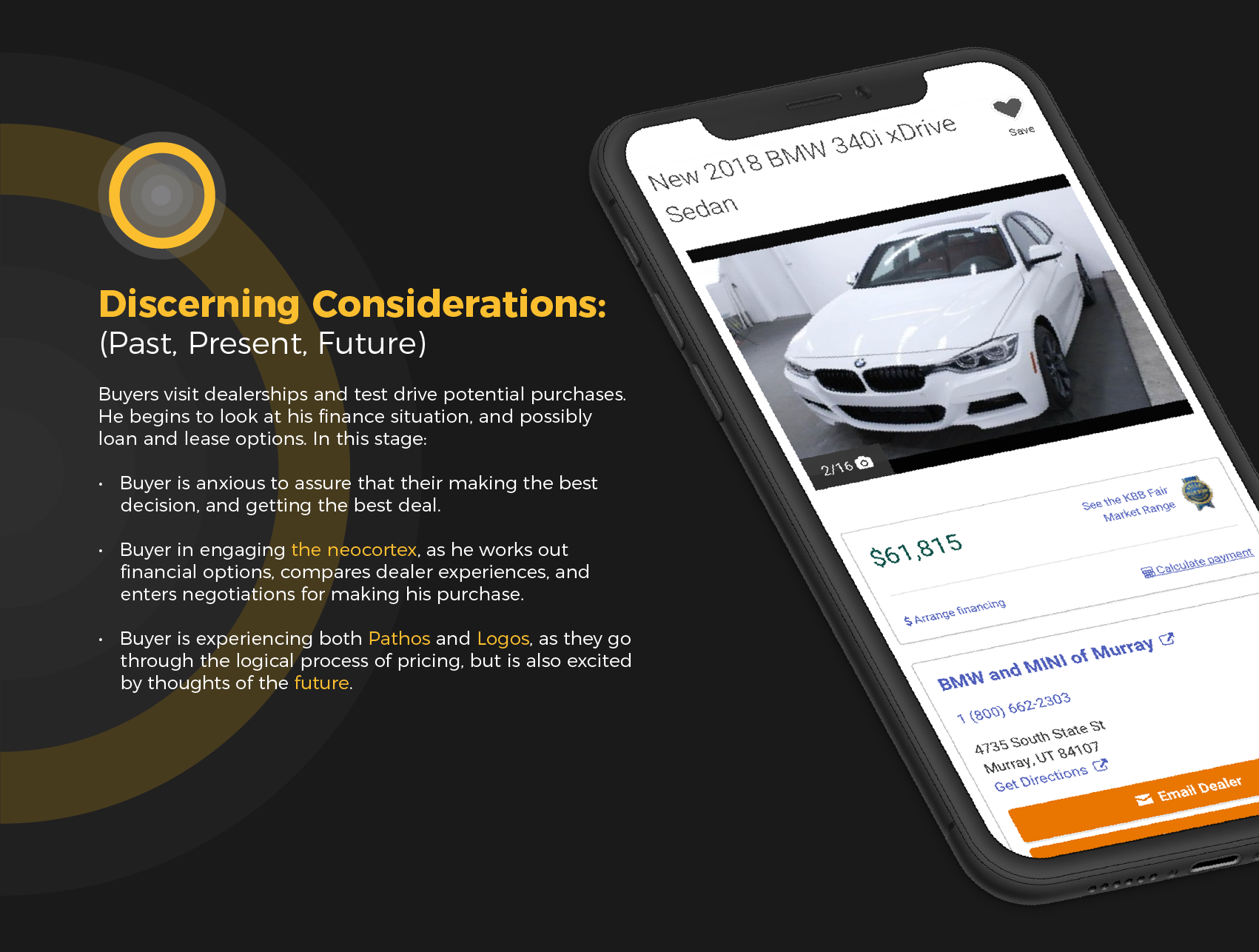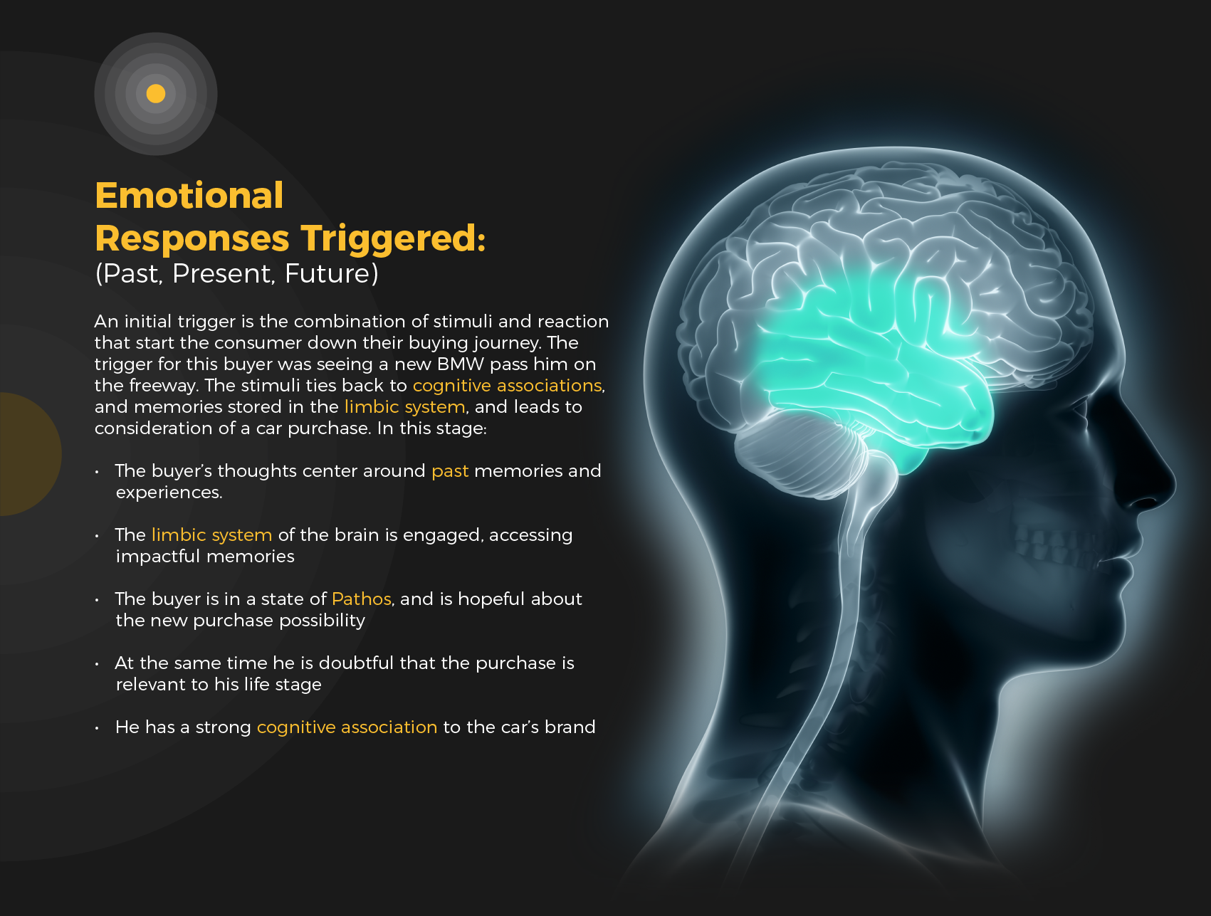 The horizontal view of the CIM brings the buyer’s path-to-purchase into focus across his or her entire journey. It outlines the transition a buyer takes from feeling the emotional triggers stemming from the past that are stored in the limbic system to entering the present day with logical thinking, and all the way through the future and the emotional-logical triggers that happen as a result of a purchase.
