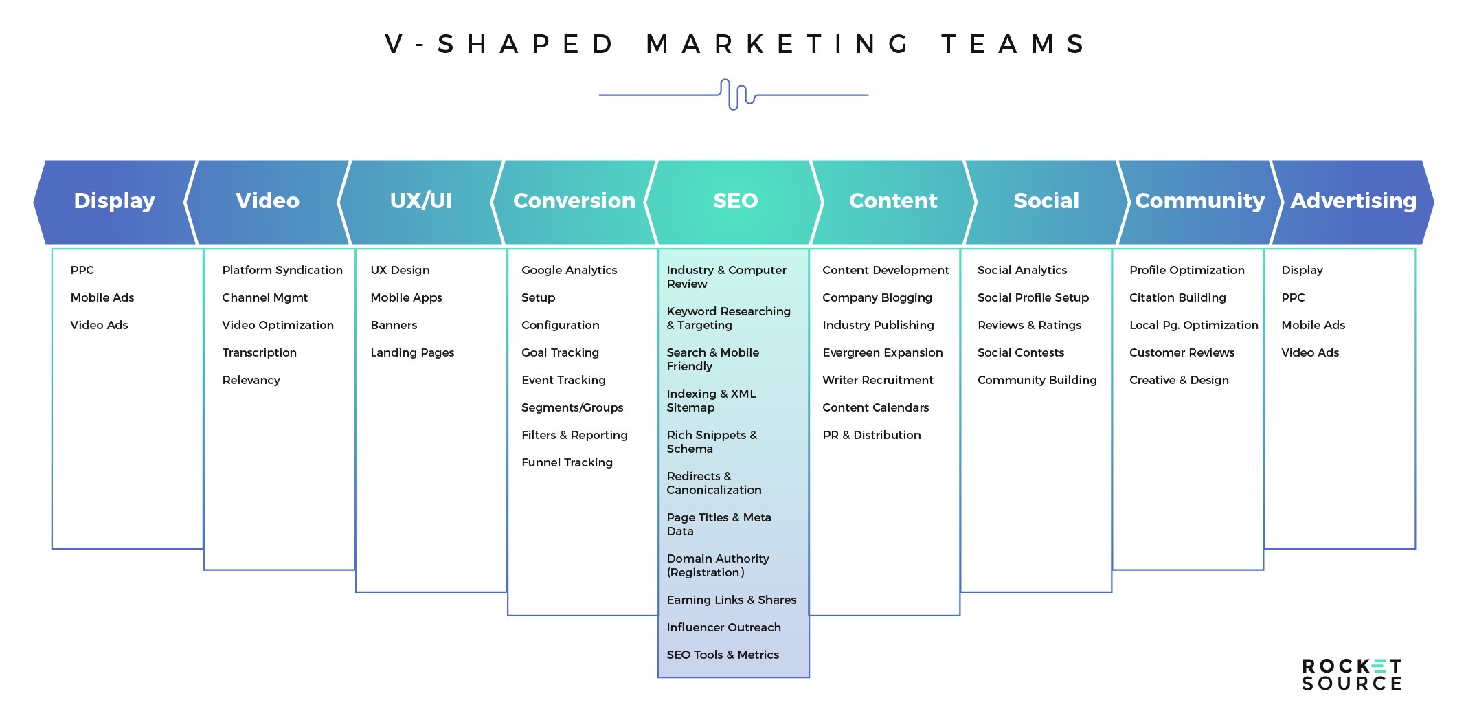 You can see that this person still has a healthy amount of knowledge in other core areas including content, social media, community, advertising, conversion, UX/UI, video and display. This approach makes a V-shaped team agile. Team members can shift from one strategy to another as the market deems necessary, which enables the business to pivot more quickly.