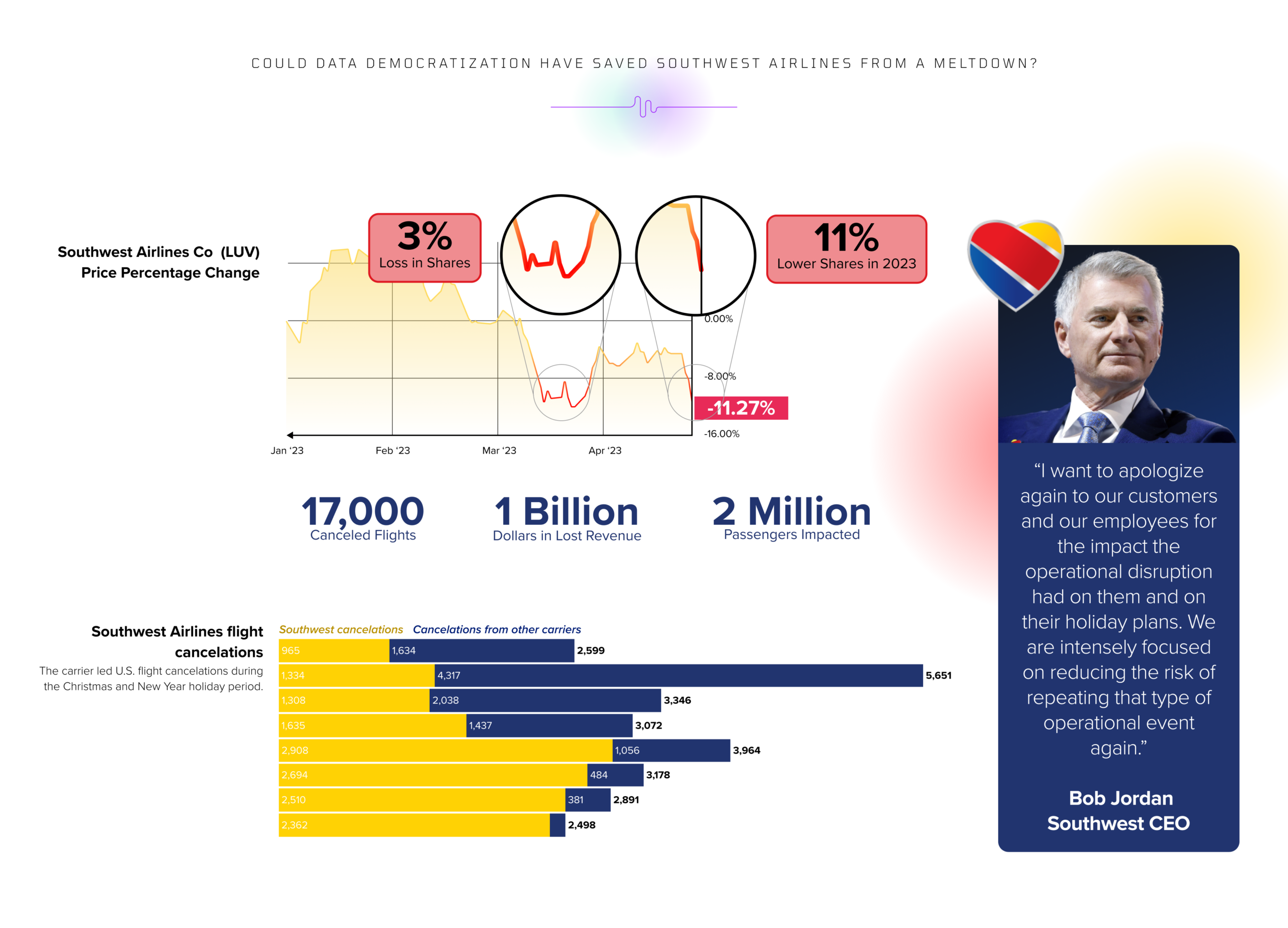 In December 2022, Southwest Airlines was blasted across headlines all over the news after canceling 17,000 flights and disrupting travel plans for more than 2 million customers. To put emotion to those eye-popping data points, here’s what happened due to Southwest Airlines’ extreme mishandling of their business. People missed funerals. Cancer patients missed treatments. Those dire human catastrophes and the enormous price tag of $1 billion in fourth-quarter earnings due to failed flight plans prompted shareholders to file a lawsuit and the Department of Transportation to investigate what went wrong.