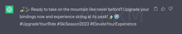 That’s just a handful of ideas that teams use or want to use to simplify this seemingly repetitive task. And we agree. There is significant potential for kickstarting the social media process using GPT tools. Here’s one example of a prompt that can be used for our fictitious ski gear company to get the conversation started.