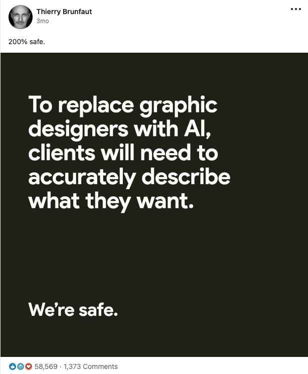 As the expression goes, there’s a little truth in jest. This meme isn’t a jab against clients. Instead, it’s a nod to the intricacies that go into something as complex and creative as graphic design. There are nuances to how a user interacts with a product, a website, or an app. The behavioral psychology that goes into designing sticky interactions and finding that Product-Market Fit isn’t something that generative AI alone can solve.