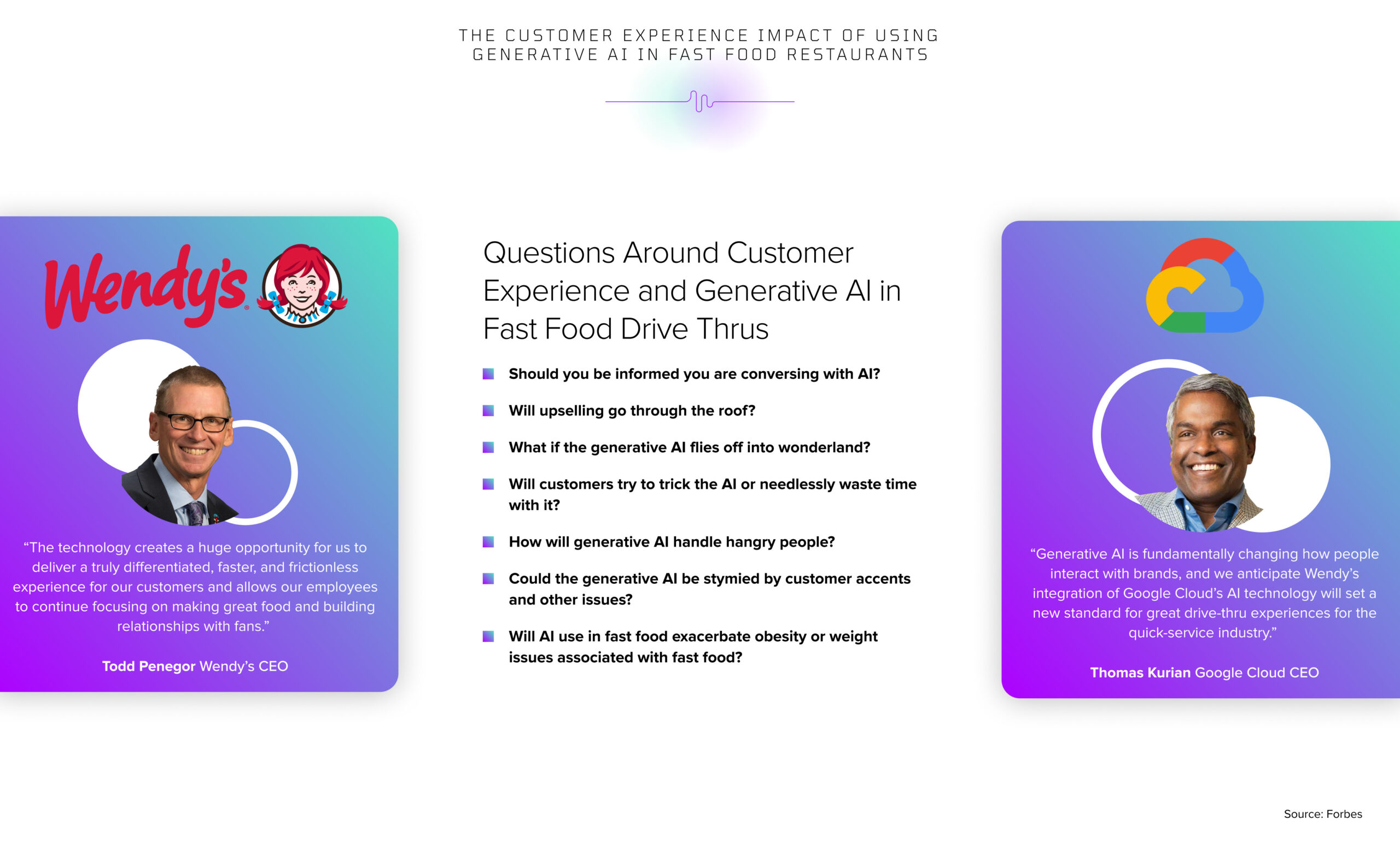 Perhaps this lack of human connection or emotional response has caused some hesitation among consumers regarding generative AI specifically. That human experience isn’t just for major life events, such as missed family memories around the Thanksgiving dinner table. It can even be felt in seemingly mundane situations, such as placing a fast food order in the drive-thru.