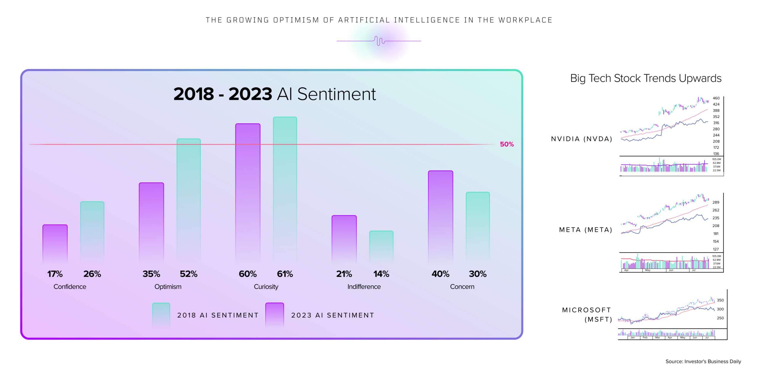 Although the threat of AI stealing jobs is real, more people surveyed by Microsoft said they hoped that AI could help with their growing workloads instead. 76% of respondents said they hoped the technology could help with administrative work, 79% with analysis, and 73% with creative work. This automation could have a distinct improvement on the employee’s experience. 64% of employees say they struggle to have the time and energy to do their job, which has caused 60% of leaders to say they’re feeling the effects of that productivity hurdle in the form of fewer innovative or breakthrough ideas.