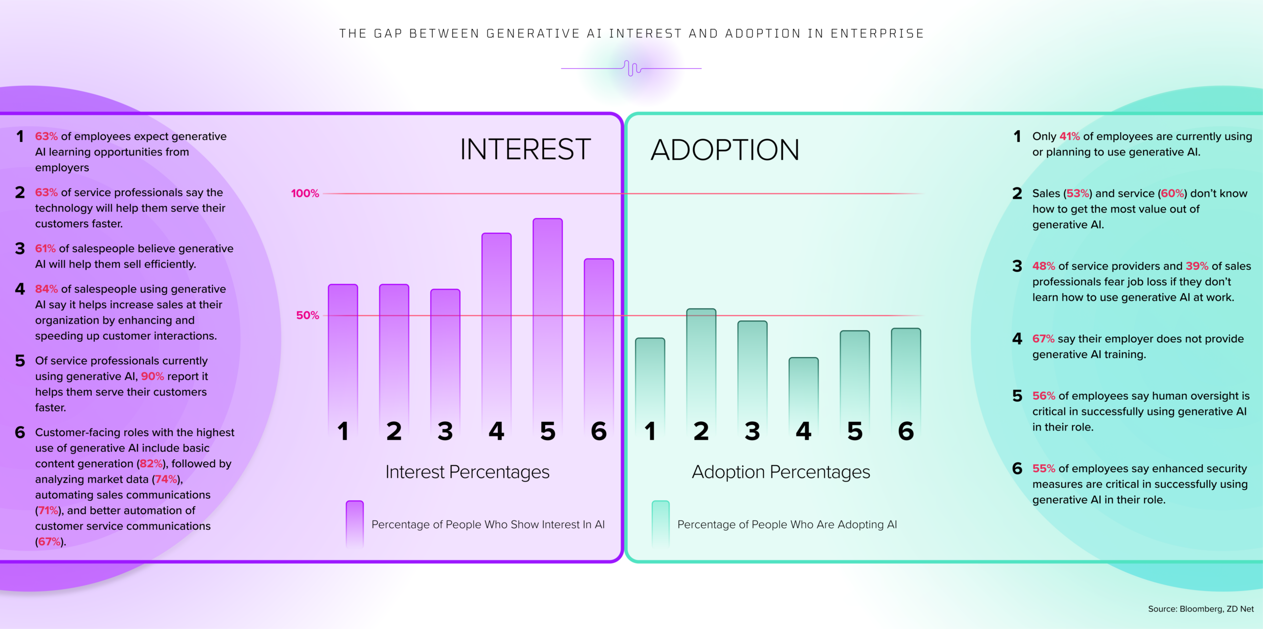 63% of service professionals believe generative AI would help them serve their customers better, and 84% of salespeople using generative AI in enterprise say it has helped them increase sales. However, only 41% of employees currently use or plan to use generative AI. What gives? Although teams know that AI has the potential to elevate their skillset and increase productivity, many worry that the potential could lead to job loss. In addition, security measures and oversight have eroded trust in the technology, causing a lot of understandable hesitation among decision-makers at the enterprise level.Despite these hesitations, an undeniable influx of innovations is happening in the enterprise world with artificial intelligence. Now, tools like ChatGPT are quickly evolving beyond being leveraged as a digital assistant and now have real implications for how efficiently and effectively enterprise organizations drive growth with AI, and without the many risks that go along with this type of transformative technology. It’s a dual-edge concern for most companies. While there’s a struggle to reach top-line goals, companies are equally challenged to protect the bottom line. Generative artificial intelligence in enterprise can impact both sides of the financial sword.