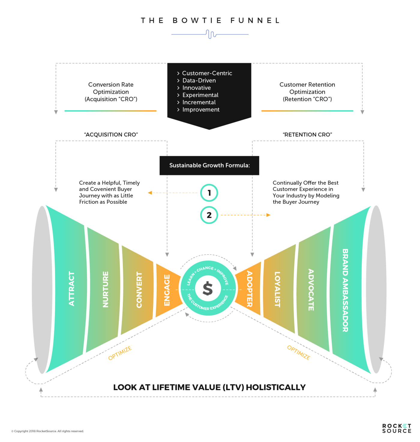 Once your team has an ingrained empathetic mindset, you can begin to take a long-term viewpoint to use machine learning models to predict what your buyers need to keep them progressing through the bow tie funnel ultimately becoming brand ambassadors. This requires you to look well beyond retention alone and leverage feature discovery techniques to identify multiple variables and thresholds that could impact a person’s decision to stay with a business or move to a competitor. Getting to the root cause of discontent lets organizations improve the experience long before it drops to the point that a customer considers leaving.