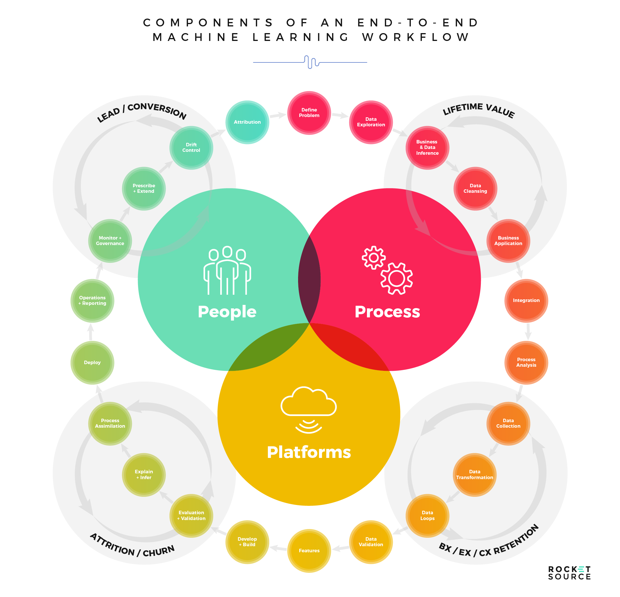 There’s a strict hierarchy of needs for driving machine learning to succeed. At the ground level of that hierarchy are the technology needed to put a new model in motion and the collection methodologies for gathering the necessary data. Too often, this is where organizations start and end, assuming that platforms will deliver actionable insights needed to transform. However, platforms are just the beginning. In order to adapt to today’s fast-paced market, you must also have the proper technology in place to collect and store the necessary data, and the proper processes for delivering clean data to your models. Once your model has that data, it must clean, aggregate, segment and analyze what’s available to deliver a predictive result.
