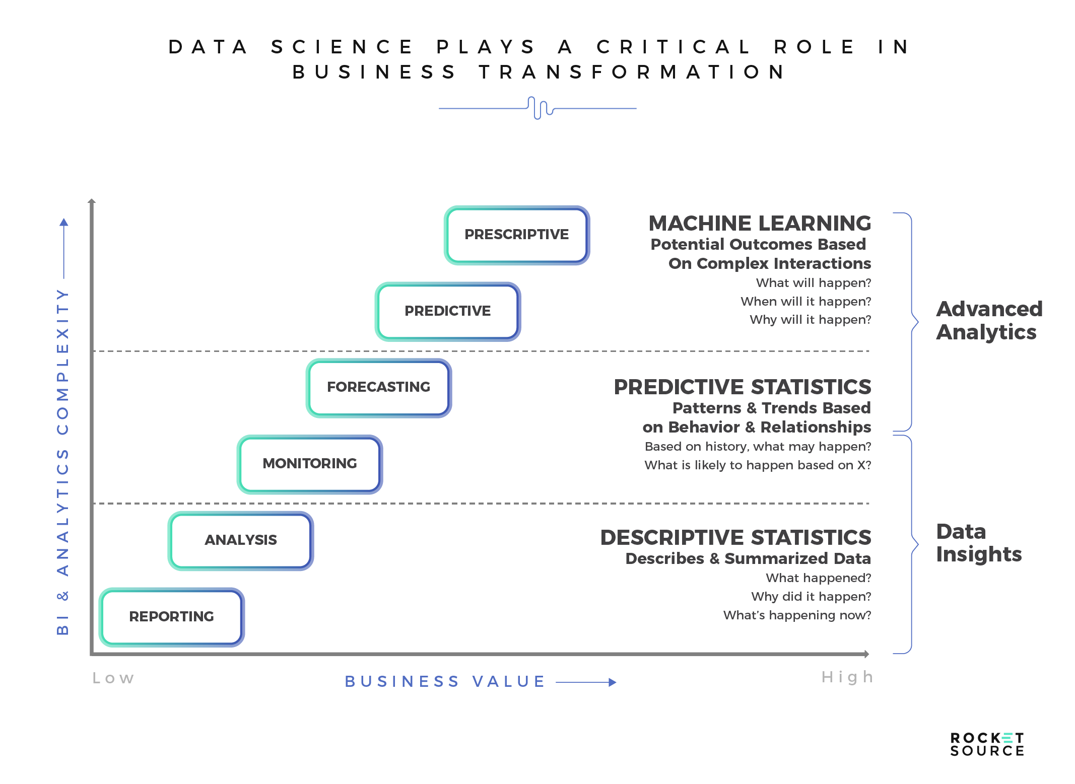 RocketSource helps transform the potential of predictive analytics into tangible business results by putting intelligent analytics at the core of business function rather than treating it as a separate R&D initiative. Doing so has a transformative and insulating influence on how organizations run their business, redefine their workforce, refine their operational efficiencies at scale, innovate and reimagine their products and services, create immersive employee and customer experiences and much, much more. Modern businesses and team leaders no longer seek answers to questions that, yesterday, seemed so normal to ask. Instead, they want to know what is likely to happen tomorrow. They want to make insights-driven predictive decisions quickly and easily, which is the promise that what RocketSource delivers — not as a horse and buggy shop — but as a transformation and innovation partner.