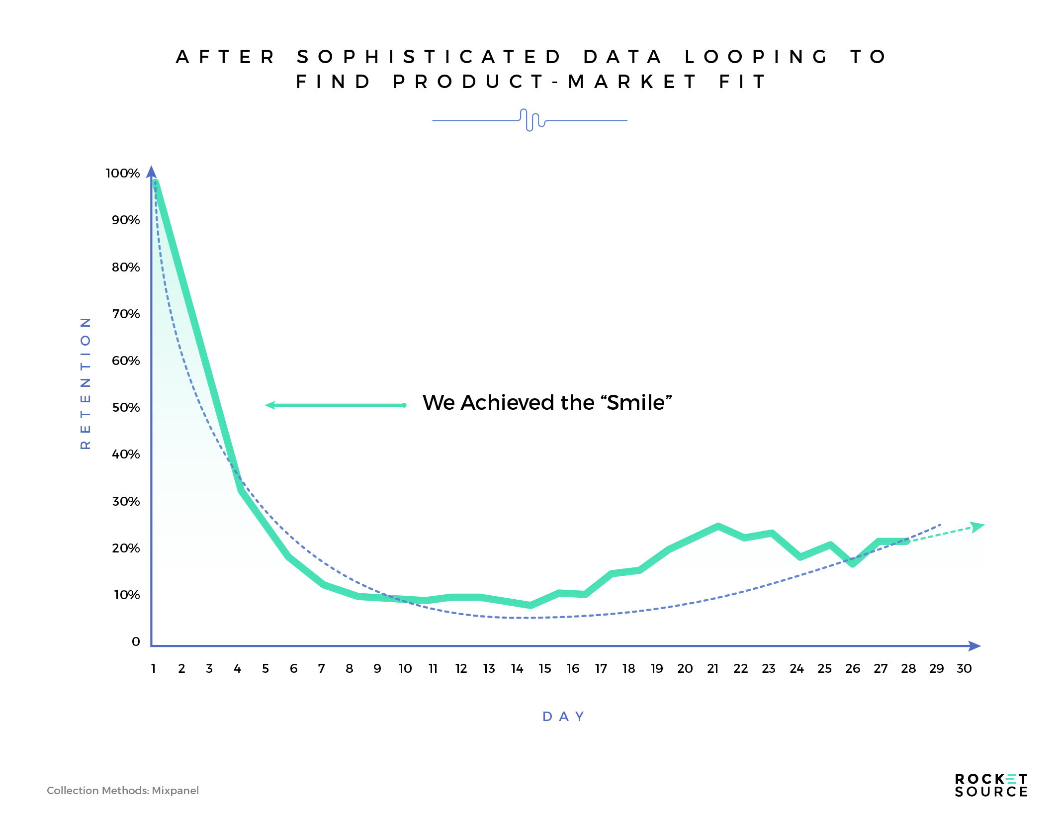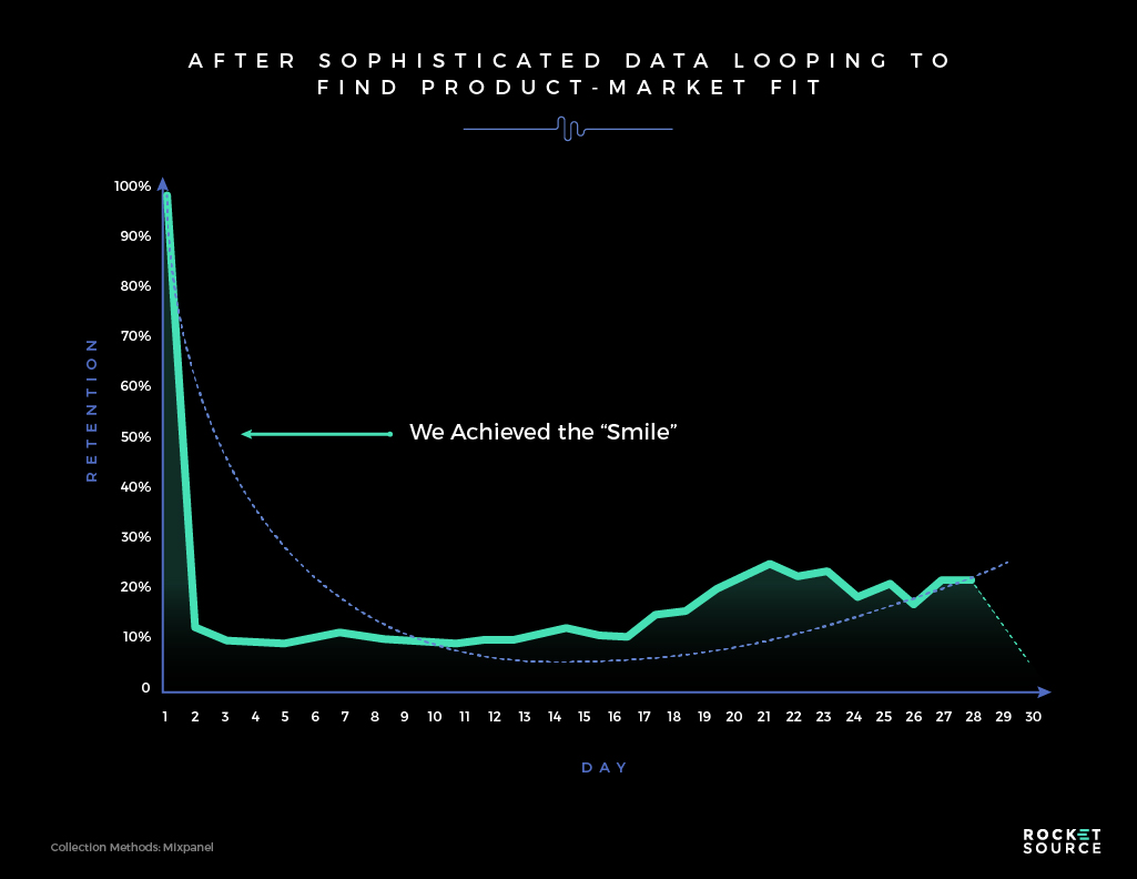 The final piece of achieving early Product-Market Fit was the way we continued to interact with our initial user base with 1 to 1 data looping, n200 strong. Each time someone requested a feature, I dropped a note into a spreadsheet. When the feature was implemented, I’d take a screenshot and send a personalized note letting that user know that a piece of them was in Platstack. Talk about feeling ingrained in a product! These users were able to squint through certain parts of the product knowing we were continuing to make it better and as a result, they became the power users driving the WOM viral effect for us. Fast forward about five months and our Mixpanel graph has taken on the coveted Retention Smile.