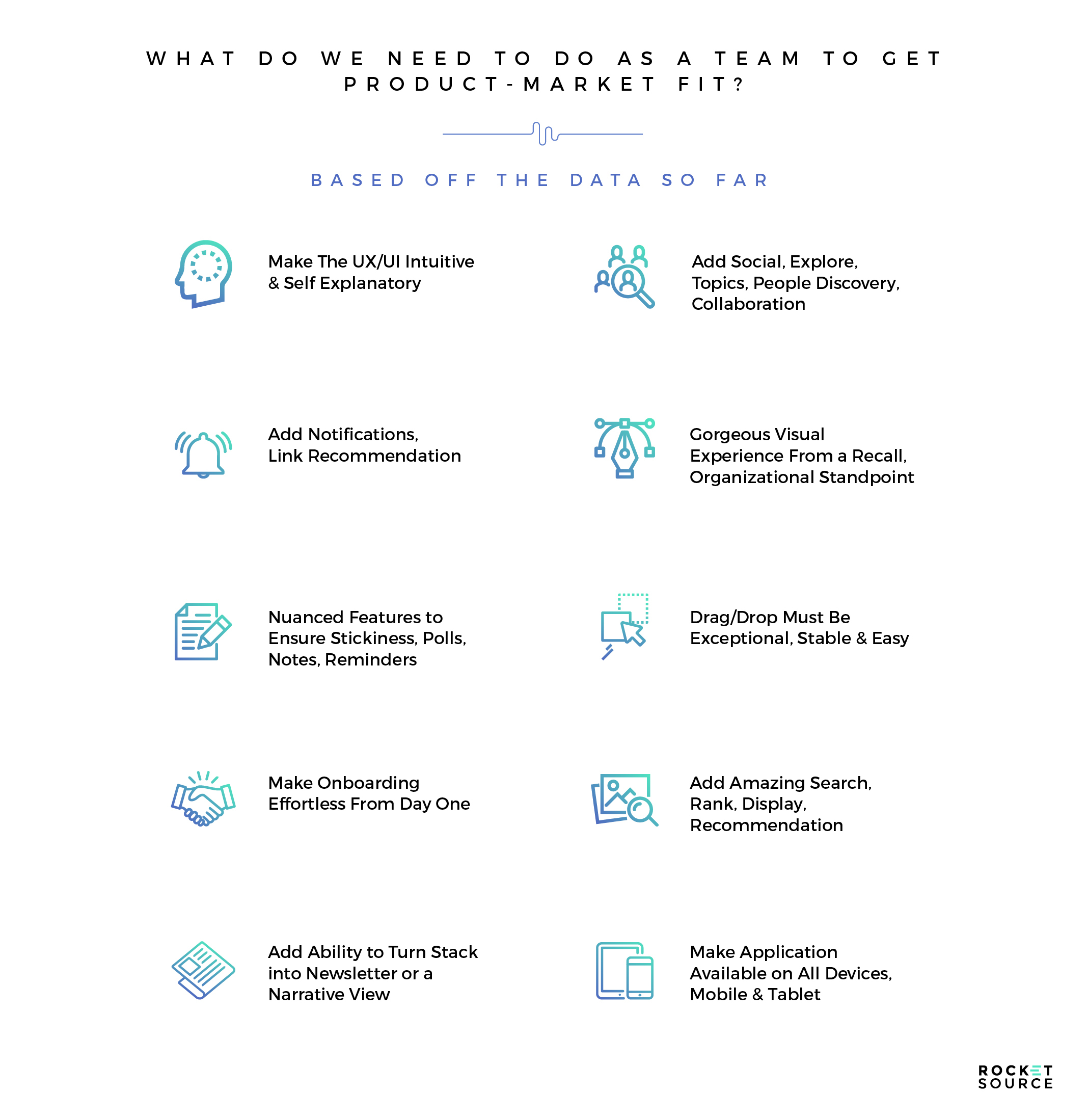 This graphic shows how we prioritize each of these features at RocketSource and for our clients before dropping them into a strategic roadmap. We print these priorities on large posters for our clients to hang in their halls to keep them top of mind for the entire team.