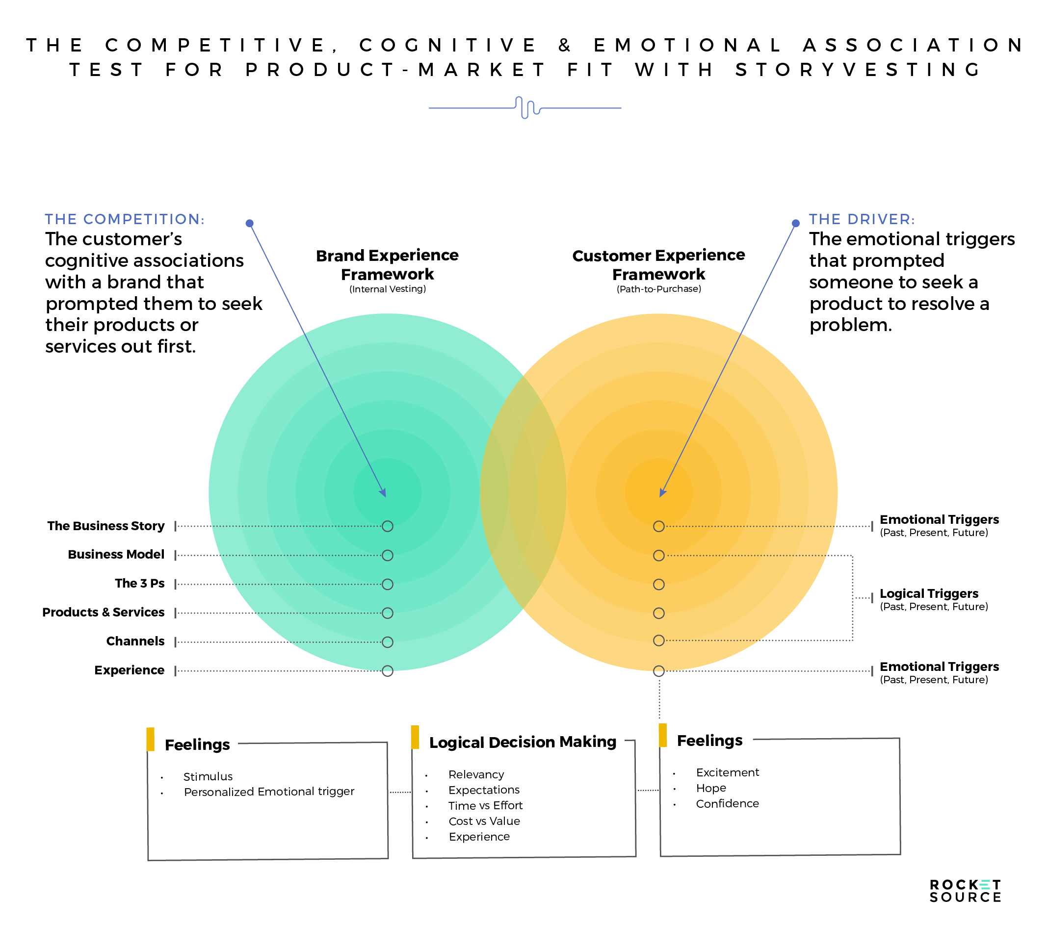 The same questioning mentality holds true for the next concentric circle in the StoryVesting framework — the business model. It’s important to analyze and address the logic behind how your company makes money, how pricing strategy and implementation affect employee retention (i.e. just go look at what former employees are saying about your BX on Glassdoor, for example). Your employees, especially those leading teams throughout your company, should be able to visually draw out the logical flow of your company’s business model. That logic can then be compared to the logical part of the customer’s journey in which they’re analyzing your offering as it relates to a variety of elements including time vs. effort, cost vs. benefit, and more.