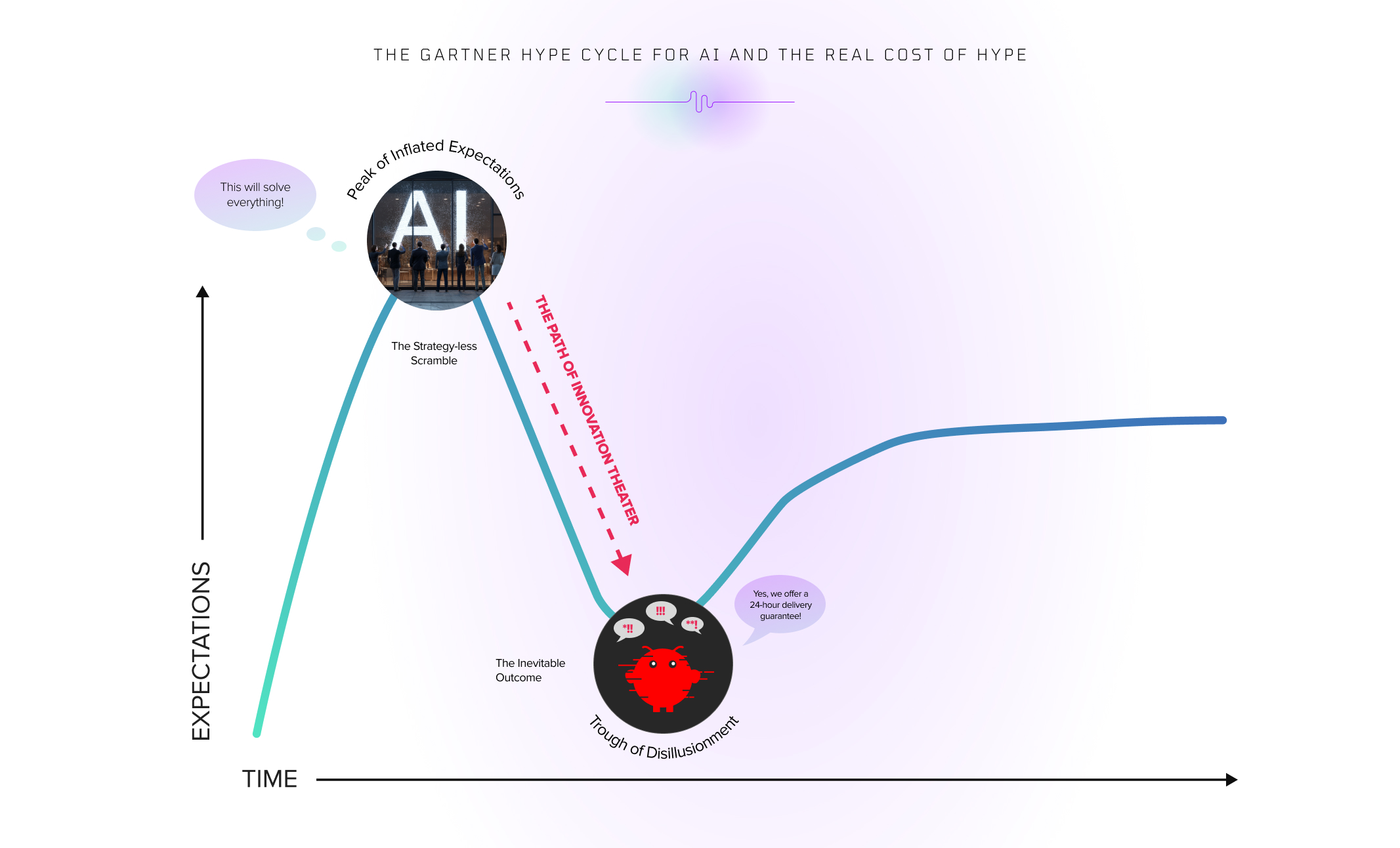The first friction point is the fallout from the AI Gold Rush. In 2023, generative AI summited the Peak of Inflated Expectations, sparking a frantic, strategy-less scramble for surface-level AI wins. As the Gartner hype cycle shows, we have collectively entered the Trough of Disillusionment, not because the technology failed, but because the strategy was absent.